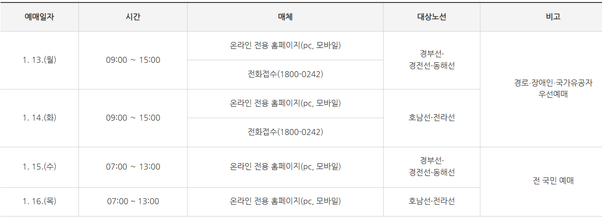 전 국민인 일반 고객들은 교통약자 예매가 끝나고 1월 15일(수) ~ 16일(목) 이틀간 설 승차권을 예매하실 수 있습니다.